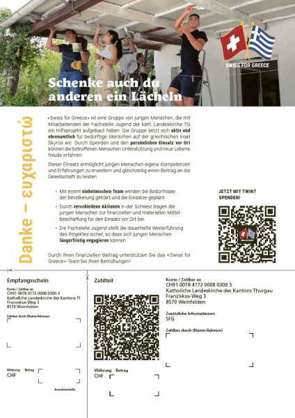 The QR code can be scanned and donated with a mobile phone. The donation is anonymous. If you would like to be thanked for your donation, please email the date, amount and contact address to jugend@kath-tg.ch after donating.
