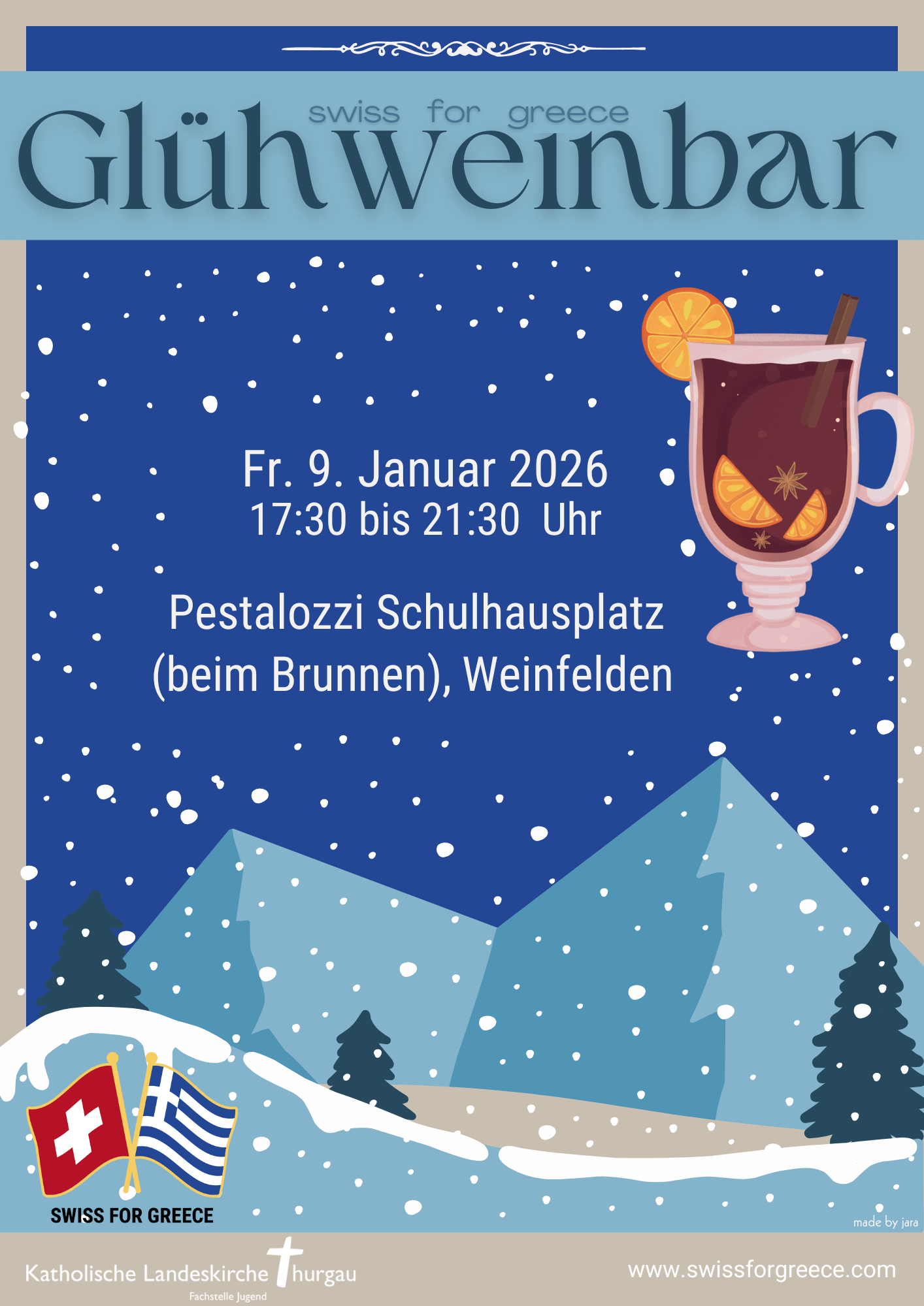 Mulled wine bar On Friday evening, you can find us at the fountain on Pestalozzi Schulhausplatz.Join us for a cosy glass of mulled wine after work and help the residents of Skyros at the same time.We look forward to seeing lots of visitors!Fri, 9 January 2026, 5.30–9.30 p.m. Action week 2026 Registration for the 2026 action week is now open.Register now at https://www.kath-tg.ch/de/event/swiss-greece-einsatz-2026 and experience an unforgettable trip. Annual plan 2025 Our activities and events for 2025 are now available in the annual plan. Under the menu item “Home” there is the tab “Annual plan” . All events for the year are listed there, so take a look and mark the dates in your diary. That way you’ll never miss an event again. Newsletter october 2025 In german only