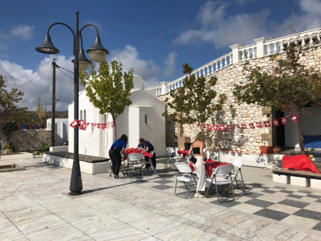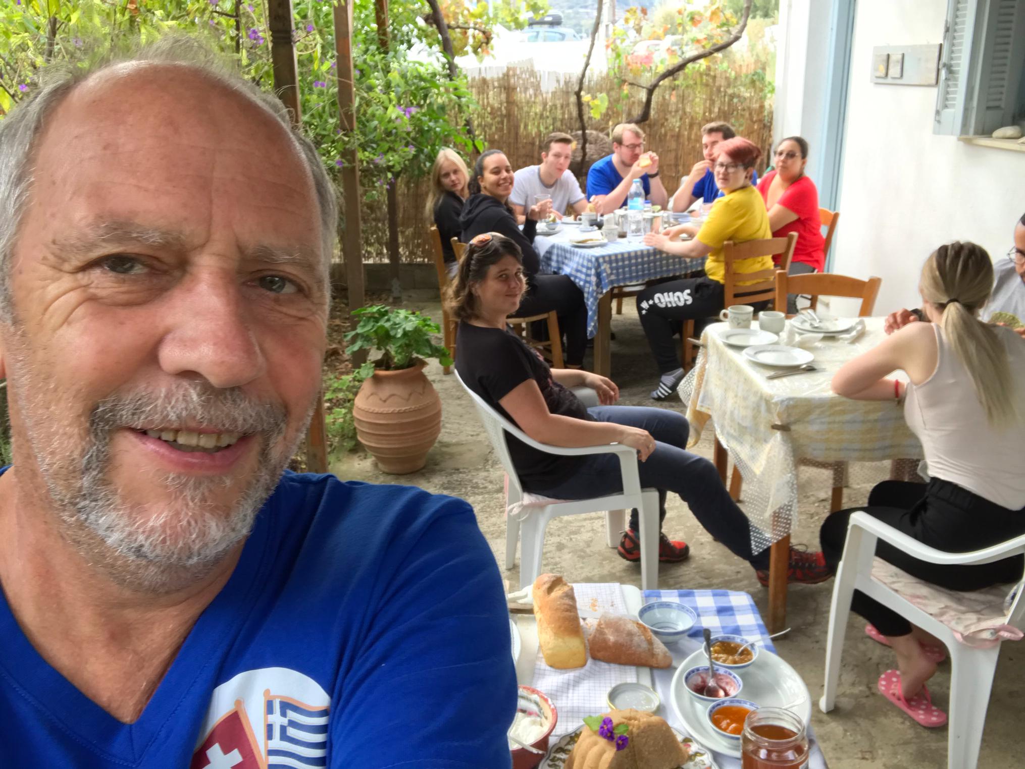 In the afternoon we organize a small meal for the inhabitants of Skyros on the village square. To Swiss music we eat Älplermacaronen. For dessert we have Basler Läckerli and Swiss chocolate. Afterwards we go back down to Molos to distribute the purchased food and pack our suitcases.